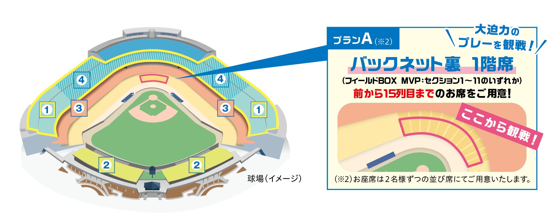 ツアー日程2日目にご案内する野球観戦の試合時の座席は、バックネット裏1階席(フィールドBOX MVP:セクション1~11のいずれか)をご用意!