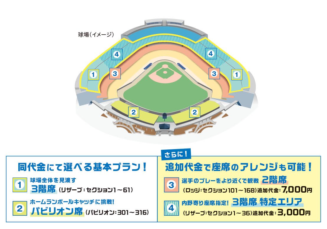 ツアー日程2日目にご案内する野球観戦の試合時の座席は、追加代金なしで2つのエリアからお選びいただけます!